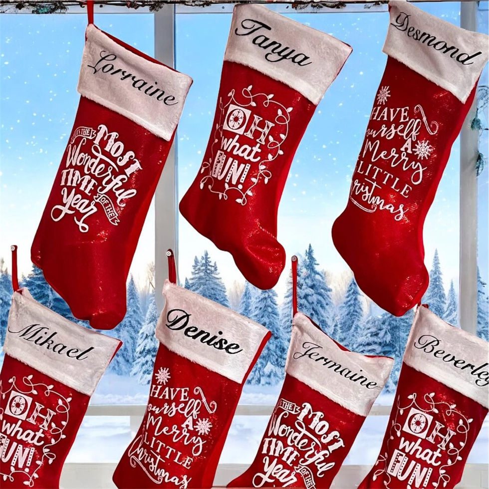 Experience the magic of Christmas with our festive decor, featuring personalized ornaments, red stockings, and Christmas-themed drink pouches. Create cherished memories with our personalized holiday decorations and gifts.